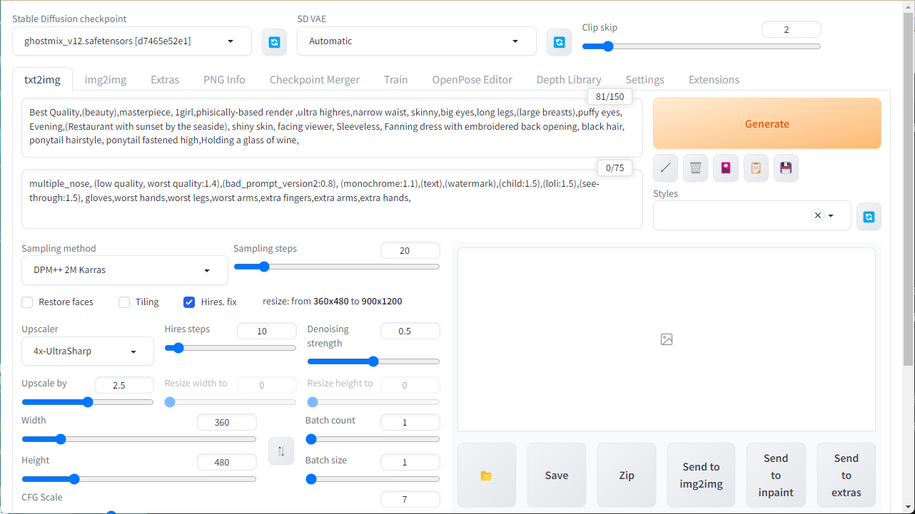 Steps: 20, Sampler: DPM++ 2M Karras, CFG scale: 7, Seed: 1837435929, Size: 360x480, Model hash: d7465e52e1, Model: ghostmix_v12, Denoising strength: 0.5, Clip skip: 2, ENSD: 31337, Version: v1.2.1, Hires upscale: 2.5, Hires steps: 10, Hires upscaler: 4x-UltraSharp