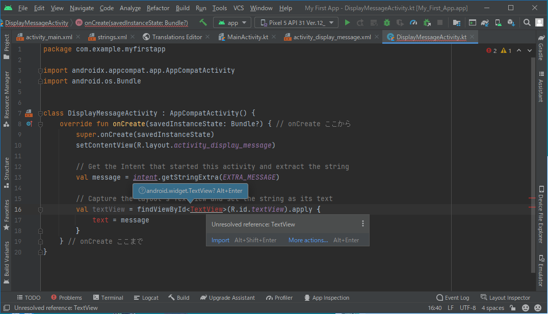 TextView が赤文字に変わっています。 必要なインポートをしましょう。