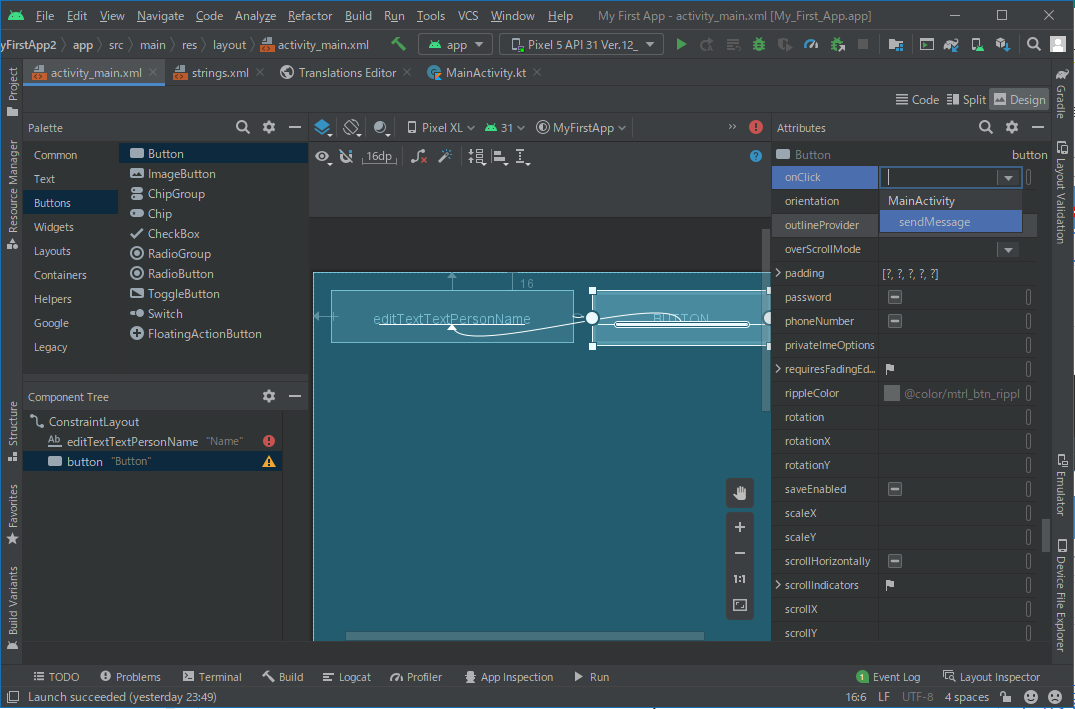 b.[Attributes] ウィンドウで [onClick] プロパティを見つけ、プルダウン リストから [sendMessage [MainActivity]] を選択します。