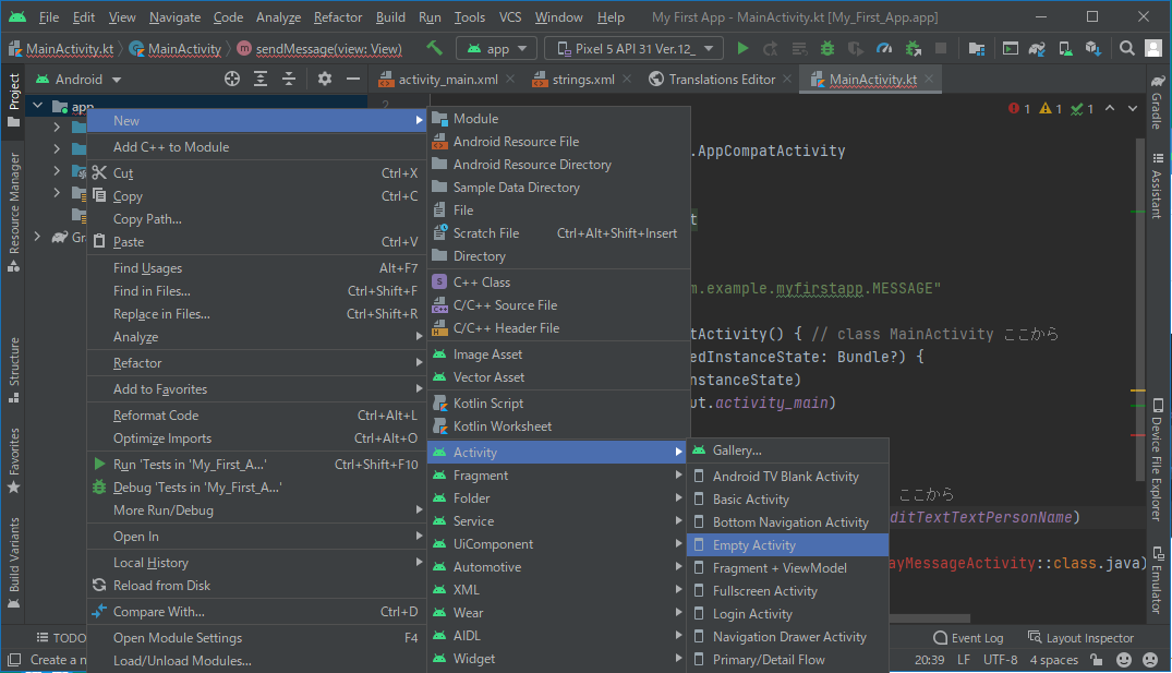 1.[Project] ウィンドウで [app] フォルダを右クリックし、[New] > [Activity] > [Empty Activity] を選択します。