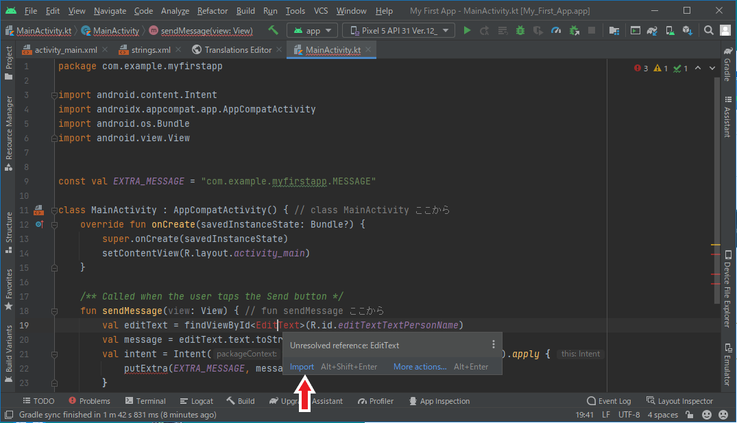 この段階で必要なことは、赤文字の箇所をクリックして、しばらく待って下記のようなメッセージが出たら、“Import” の青文字をクリックすることが出来れば十分と考えます。 クリックすると、3行目から6行目にあるような “import android.~” のような行が追加されます。 普段は、”+” マークのみで非表示になっているため、 “+” マーク をクリックして表示させます。